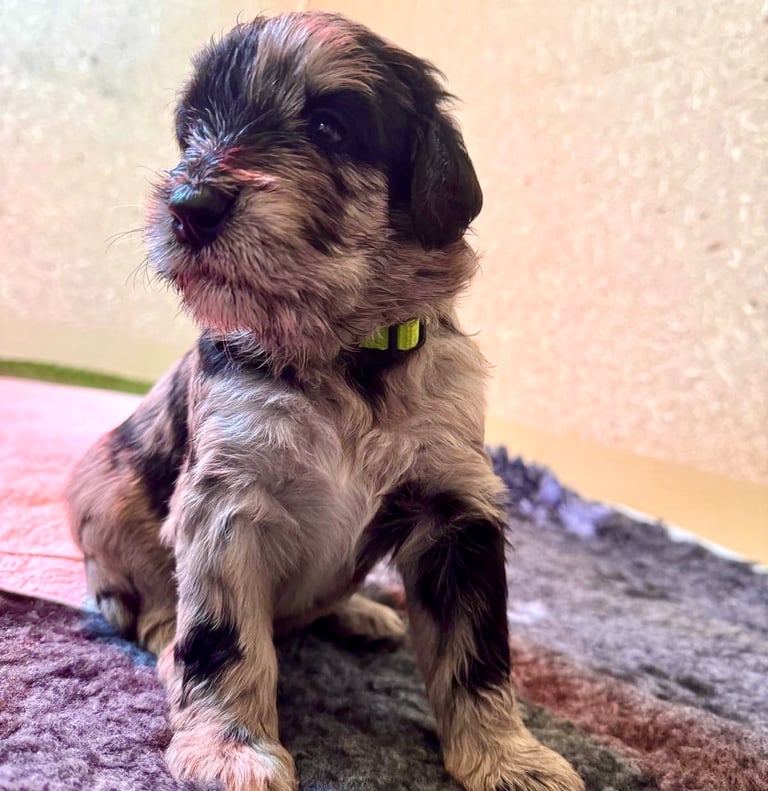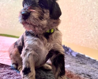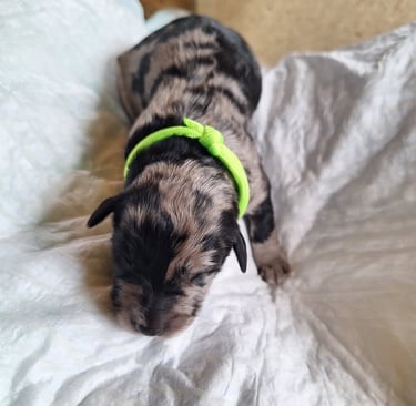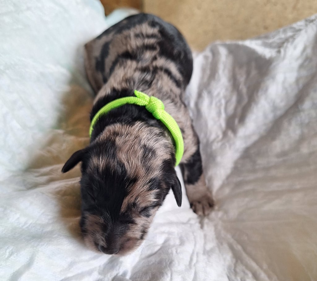 Hallo! Ich bin der Vierte aus dem Wurf. Ihr erkennt mich am hellgrünen Halsband. Mein Geburtsgewicht war 450g. Meine Fellfarbe ist merle.