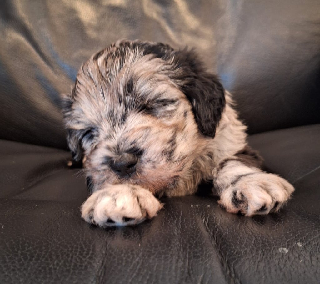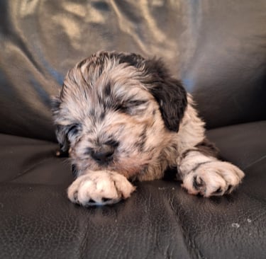 Hallo! Ich bin die Fünfte aus dem Wurf und das dritte Mädchen. Mein Geburtsgewicht war 410g. Jetzt sind es 2585g. Meine Fellfarbe ist merle.