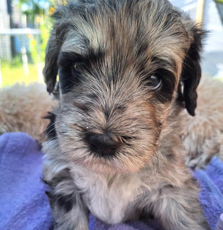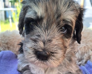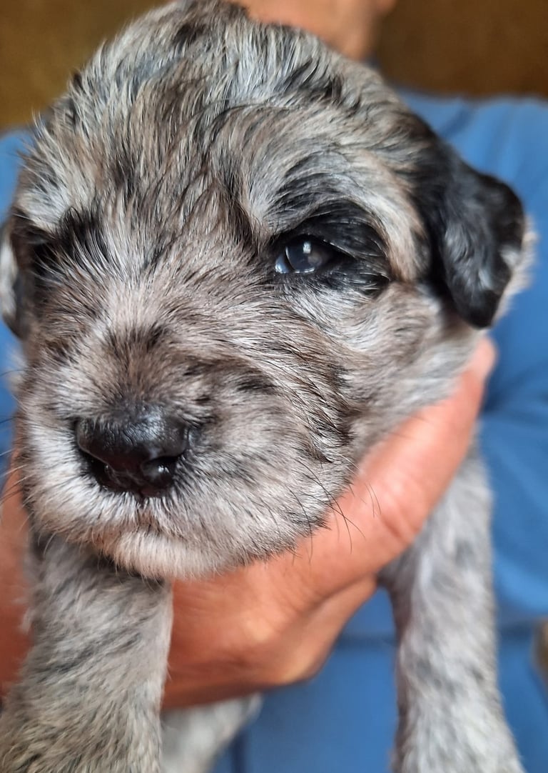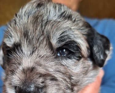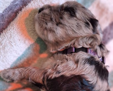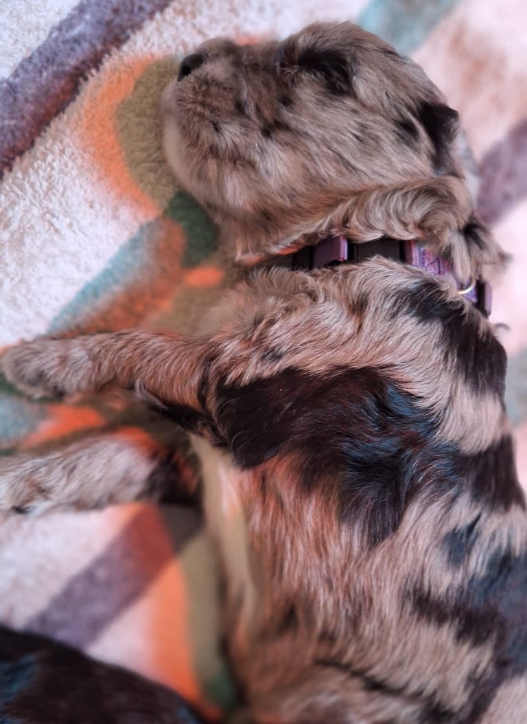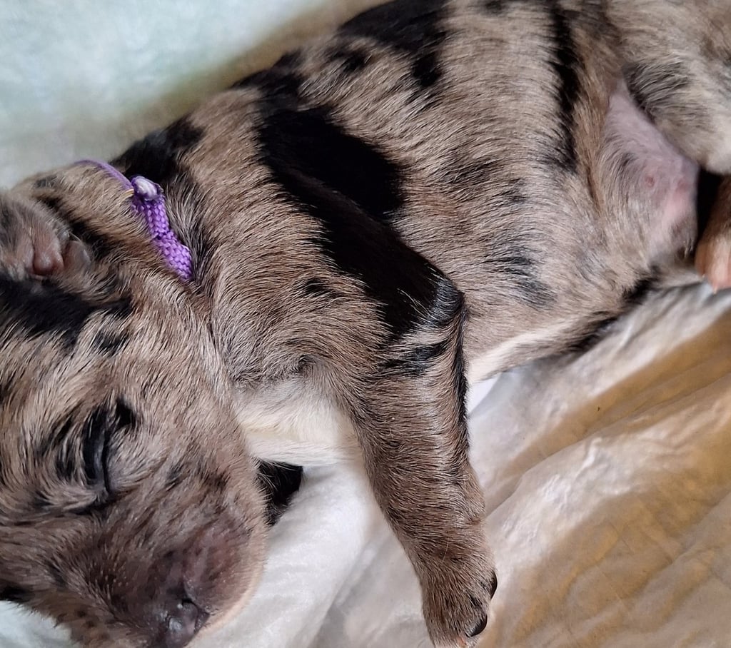 Hallo! Ich bin der Siebste und Letzte aus dem Wurf. Ihr erkennt mich am lila Halsband. Mit 395g bin ich der Kleinste, aber ich werde besonders umsorgt und gepäppelt. Meine Fellfarbe ist merle.